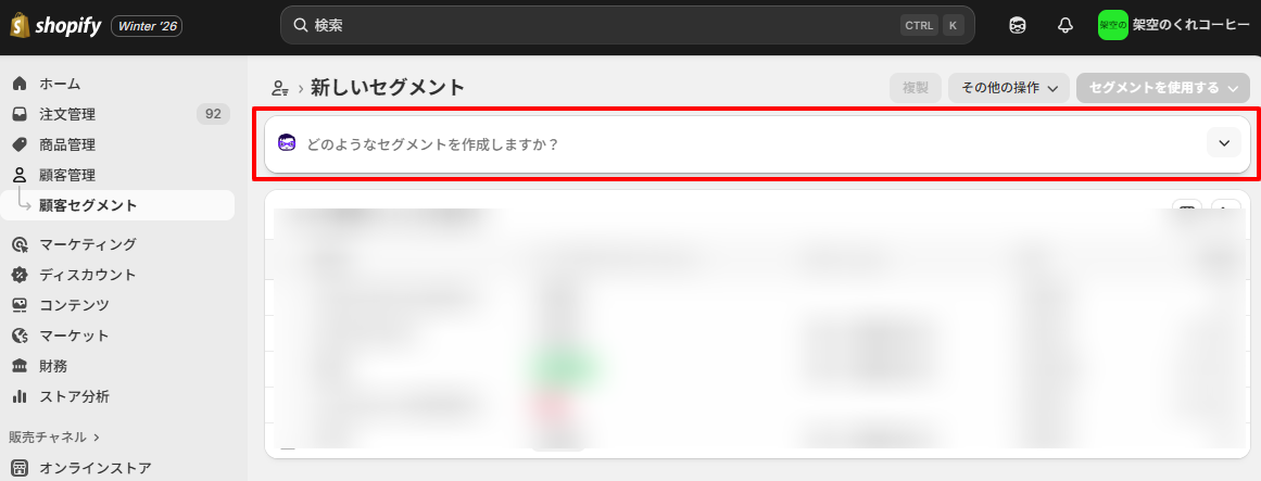 「顧客管理」→「顧客セグメント」から「セグメントを作成する」を開くと、Sidekick入力枠が表示されます。